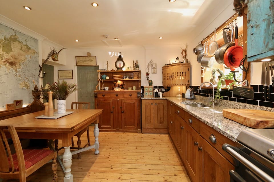 The kitchen is well stocked with ingredients and kitchen utensils. There is a large fridge freezer and everhot range cooker, with fitted oak units and granite worktops. The lounge has a very warm coal burning stove.