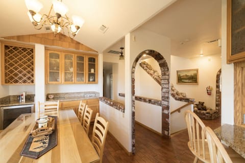 The fully stocked gourmet kitchen at Grand Village Lodge, seamlessly blends style and functionality for an exceptional cooking and dining experience. Featuring a gas range with double oven, dishwasher, microwave, coffee maker, and Keurig Coffee maker. Enjoy a quick breakfast at the kitchen island with 2 barstools, or a family style meal at the large dining table with seating for eight. The layout of the kitchen and modern amenities make it the perfect hub for creating delicious meals or hosting friends for cocktails & hors devours and enjoying the company of your group.