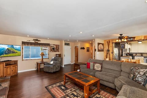 Step into a welcoming and open main living area with wood floors, cozy log-style furnishings, and a gas fireplace to warm up your evenings. Whether you're gathering for movie night or lounging by the fire, this home offers comfort and space for everyone.