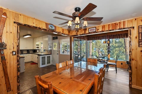 ✓ Dining Room: Rustic Log Dining Table for 6 + Charming Glass-Surrounded Breakfast Nook w/ Additional Seating
