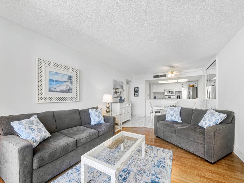 Living Room - The Living room has a sofa, two chairs, and a Flat Screen TV. Open the sliding glass doors to enjoy the sounds of the water and Gulf front breezes.