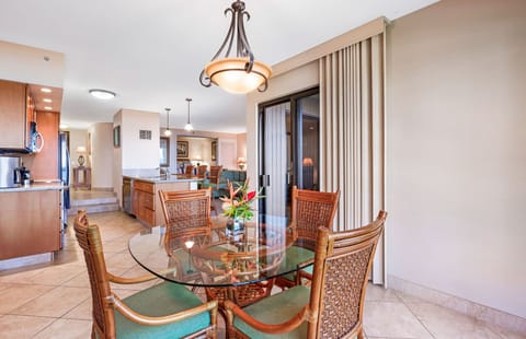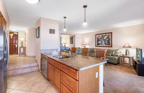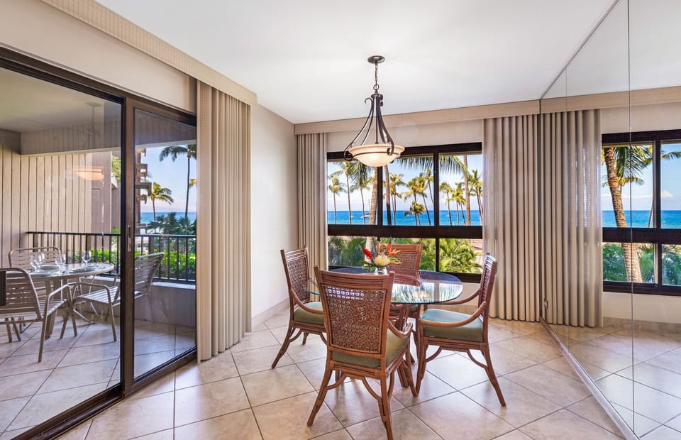 The suite comfortably accommodates up to six guests with ample room to spare. Fall into a restful sojourn in either the king-sized primary bed or the queen-sized bed nestled within the converted den. Each bedroom has an adjoining bathroom that has been fully renovated for a lavish bath experience. If needed, the pullout sofa converts into a queen bed as well. The kitchen is fully appointed, allowing an opportunity for your culinary creativity to be expressed. The in-suite dining area directly overlooks the verdant Ali'i courtyard as well as the widely-acclaimed golden beach and crystal blue ocean beyond.