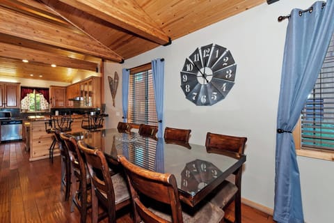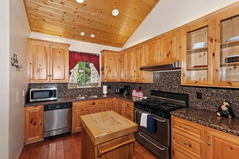 From the moment you enter Blue Moon, you're greeted by soaring vaulted ceilings, custom woodwork, and a welcoming blend of rustic charm and upscale comfort. The bright open-concept living area features a cozy wood-burning fireplace, large flat screen TV, and access to the back deck where you’ll find peaceful forest views and space to unwind.