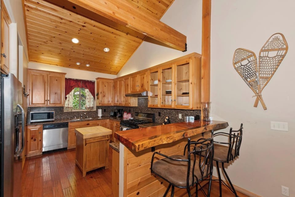 Whether you're cooking a family-style dinner or whipping up breakfast before a day on the slopes, the well-equipped kitchen has everything you need — and more. Keep the cook company at the live-edge bar or gather around the bar-height dining table for a meal together.