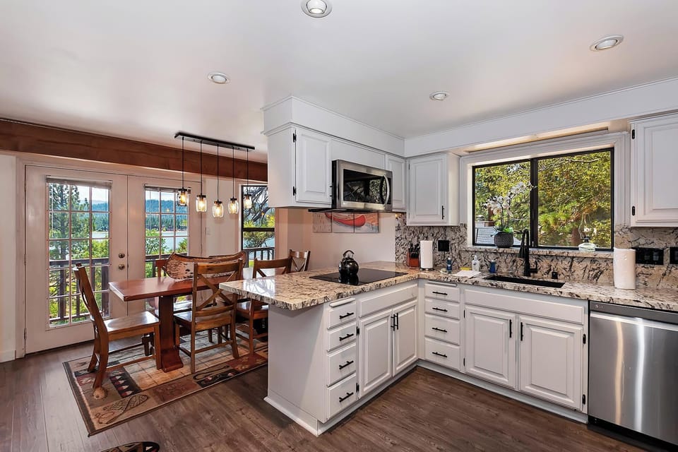 The kitchen provides everything needed to prepare family meals, snacks, or vacation treats. Enjoy casual dining at the breakfast bar or savor meals with panoramic lake views from the adjacent dining space.