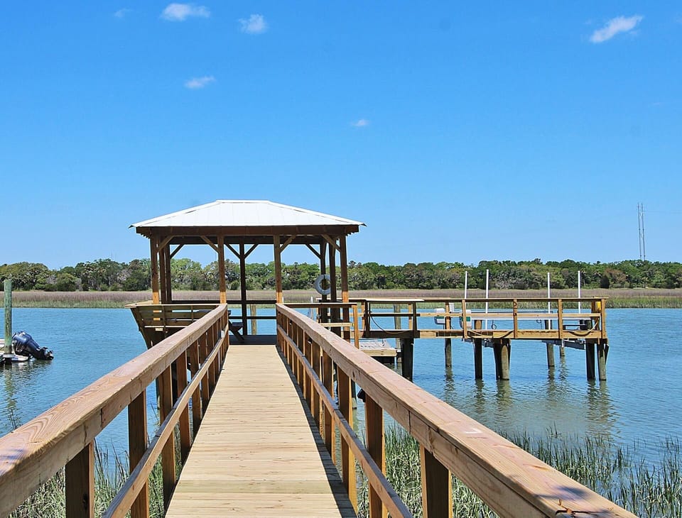 The spacious lot and large canopy of live oaks on the bank of Hamlin Creek make you think you're back in the antebellum South. The updated cottage has retained an "island essence" and offers the perfect spot for enjoying nature and experiencing island life. Owner maintained and a unique experience for your vacation! Deep water dock comes with 30 amp electrical service and water hookups 5' at low tide, (Boat lift on site is only for owner use)