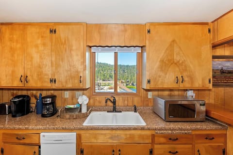Located on the upper level, the main living room offers warm mountain charm with lake views just outside the windows. Gather on the comfortable sofa, watch a movie from the large DVD collection, or enjoy the glow of the wood burning fireplace after a day by the water.