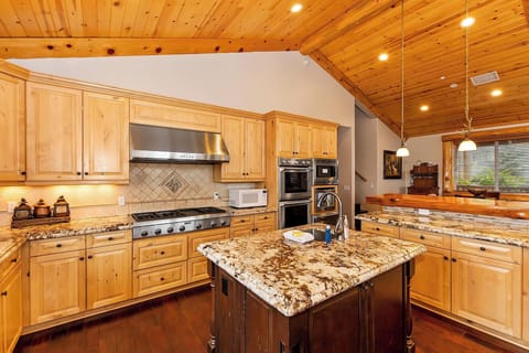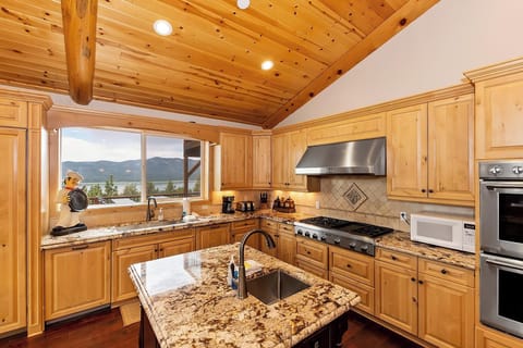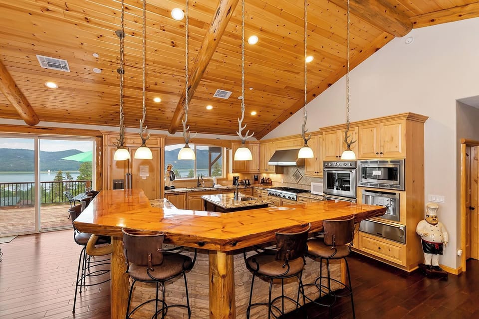 Designed for both the casual cook and the culinary enthusiast, the gourmet kitchen features granite countertops, stainless steel appliances, and two ovens for preparing large meals. A natural log breakfast bar comfortably seats six to enjoy the breathtaking views of the lake.