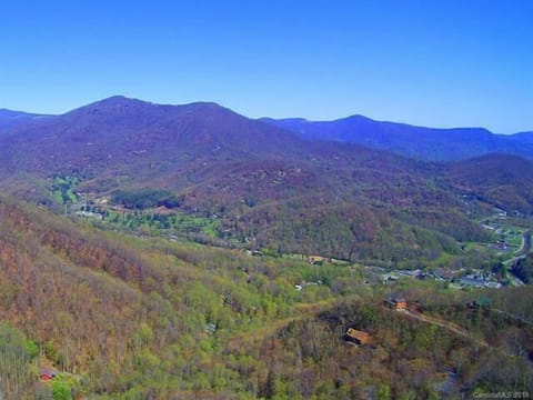 Upper Level: Includes a very large master bedroom with king bed, flat screen TV, desk, large tub, shower and double sinks. The spectacular views from the window in this room are of Maggie Valley and Waynesville.