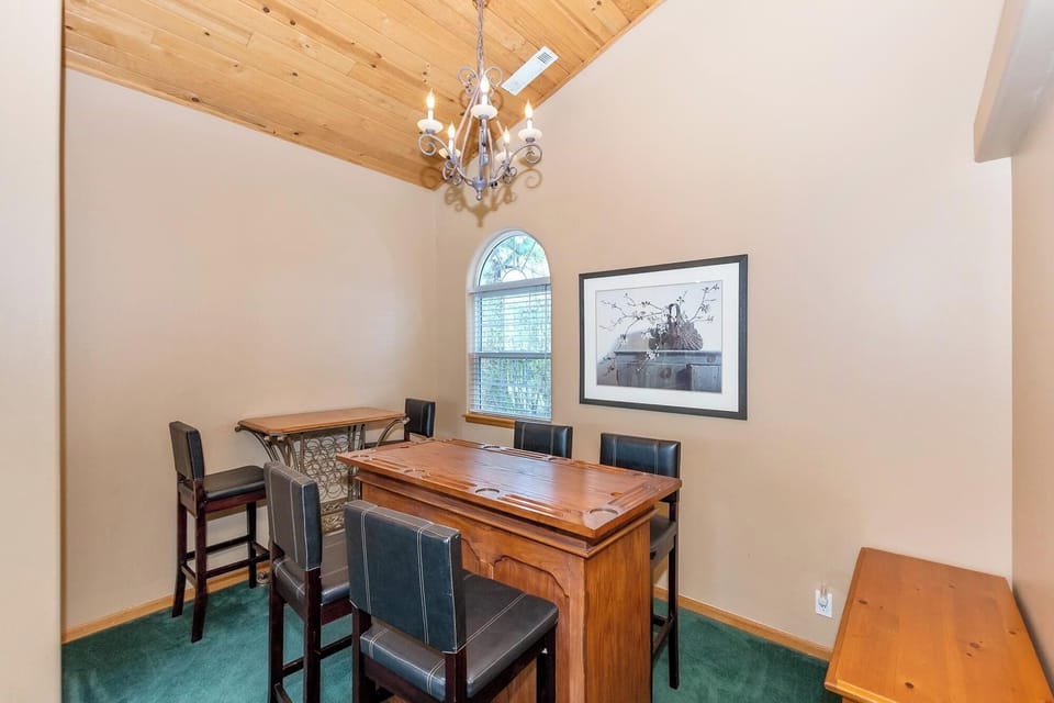 Step into a spacious great room with vaulted ceilings, a wood-burning fireplace, and cozy seating perfect for gathering with loved ones. The interchangeable bar & game table offers multiple game options, ensuring endless fun for your group.