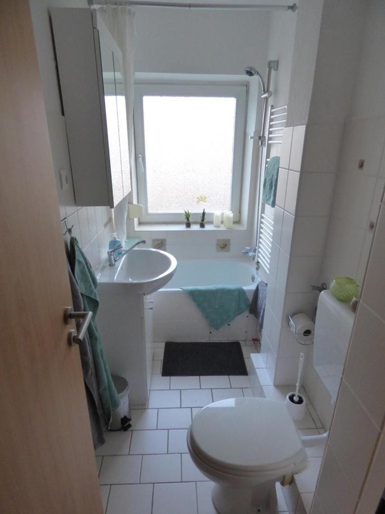 Im Badezimmer gab es beim Einzug Stiefelspuren von jemandem. Unterhalb des Fensterrahmens im Badezimmer sammelt sich die Feuchtigkeit, wodurch dort Schimmel entsteht. Die Tür ins Badezimmer quietscht manchmal zu dolle. In der Küche sieht der Boden ziemlich verschlissen aus. Die Rauchmelder waren ab.