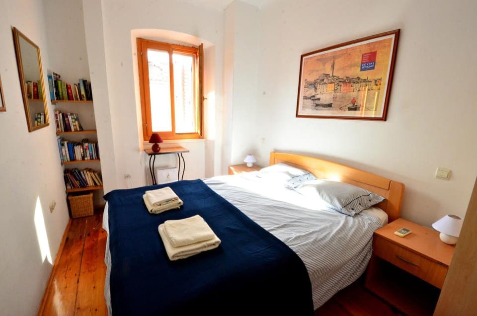 Virkeligt centralt beliggende i hjertet af Rovinj med egen balkon, hvor der var udsigt til havet på begge sider og til gågaden lige nedenunder, hvor der blev spillet akustisk livemusik til kl. ca. 23. God stor lejlighed med to separate værelser og lækker aircondition, der svalede på de meget varme dage. Bager i stueetagen, 3 ATM-automater indenfor 50 meter og samme afstand til de små hyggelige gader i den gamle by.