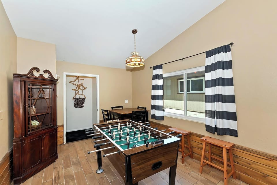 ✔Living Room: Sofa, wood-burning fireplace, flat screen TV with cable, small dining area, and foosball table
