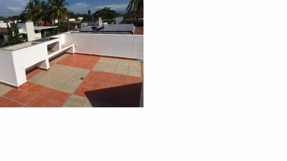 Roof top deck with Hot tub, seating area .
