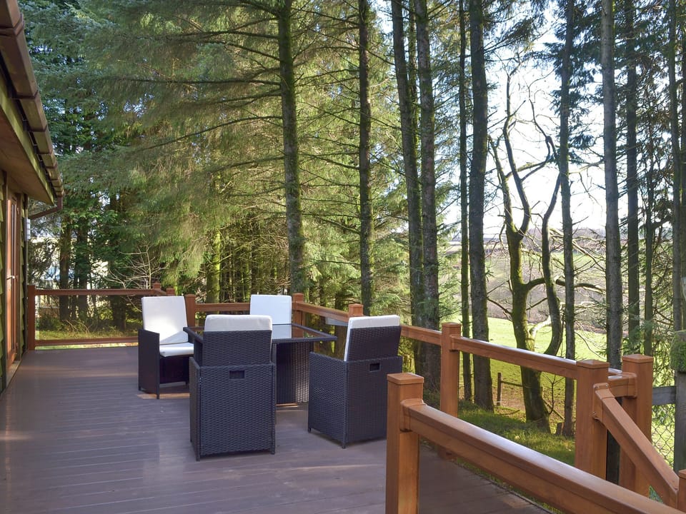 Bedroom 2: Zip And Link Super Kingsize Bed (2 x Singles On Request), French Doors Leading To Patio Ensuite: Bath With Shower Over, Toilet. Air source underfloor central heating, electricity, bed linen, towels and Wi-Fi included. Travel cot and highchair available on request. Welcome pack. Enclosed lawned garden with decked patio and garden furniture. External utility room with washing machine. 21-acre natural grounds. Bike store. Private parking for 2 cars. Electric car charging point, at cost. No smoking. Please note: The property has a natural water supply from a spring. There are 3 steps in the garden and a stream in the grounds.. This superb detached lodge is set in a tranquil, rural location on the edge of Exmoor National Park. The contemporary interior is bright and airy and boasts air source underfloor heating throughout the property. The living area and bedrooms all have French doors with level access onto a large south-facing decked patio with views through the pine trees across the open countryside and three steps down to the garden area. This property is ideal for less mobile guests and wheelchair users, being situated all on one level, ramp access to the entrance, and an en-suite wet room in one of the bedrooms.