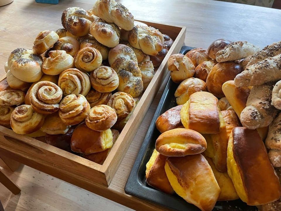 Our apartments are called apple tree, cherry tree and pear tree and are located on the first and second floor of our farmhouse. We made every effort to make the apartments cozy and close to nature. The rooms are generously built. Natural furniture and wooden floors with sheep wool carpets dominate the furnishings. A large balcony all around offers a wonderful view of our mountains. You will also find: SatTV, CD player, radio, washing machine, dishwasher, blender, toaster, coffee machine, espresso machine, kettle, oven, fridge freezer. Towels, sheets, cleaning utensils, vacuum cleaners are available. The apartment Birnbaum is 80 square meters, can accommodate 7 guests and is divided as follows: entrance hall, kitchen, living room with double bed, toilet, bathroom, second bedroom with bunk beds and single bed, third bedroom with double bed. Balcony to the south.