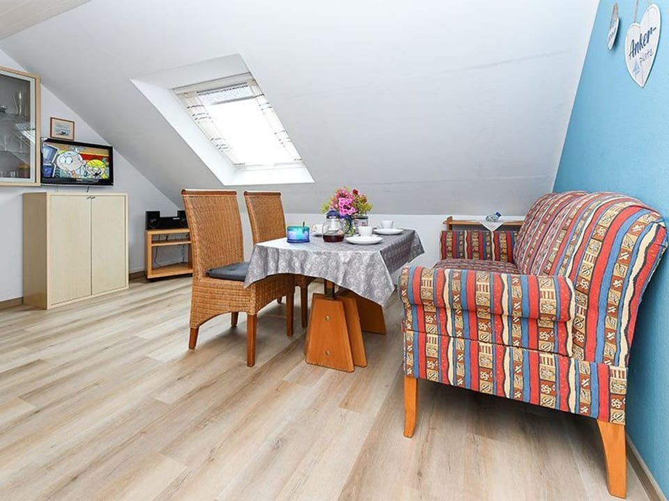 Size about 50 square meters, living room with integrated kitchen, bedroom, second separate bedroom / children's room, bathroom with shower, vanity and toilet, upstairs, ideal for 2 to 3 people and in addition a toddler.