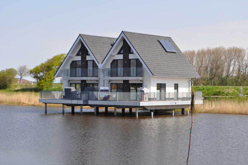 Experience exclusive living on the water in this newly built stilt house. The light-filled semi-detached house offers you first-class comfort with its high quality and modern equipment. On the ground floor there is a spacious living and dining area with an open kitchen. The attached terrace is ideal for a sunny breakfast or a glass of wine in the evening with friends or family. There is also a bathroom with shower and toilet. The upper floor has 3 separate bedrooms (2 x 1 double bed, each with access to the balcony, 1 x 2 single beds) and another bathroom with shower and toilet. The holiday home can accommodate up to 6 adults and a toddler up to 2 years old. WLAN is available for free.