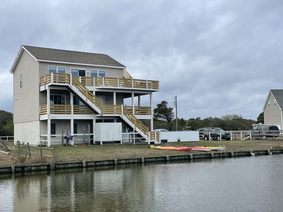 We are located approx 9 miles from the end of highway 12 at Milepost 21.5 and ACCESSIBLE BY 4WD/AWD ONLY. You will be driving on sand at the end of the paved road. This canal front home is an updated 5 bedroom, 4 bathroom vacation rental that sleeps 14 guests comfortably. The home was remodeled in 2017 and received many additional updates in 2022 and 2023. In 2022, we invested in a charcoal filtration with reverse osmosis water system installed in our home to combat the infamous Carova water. Contrary to previous reviews, the home’s water system has been overhauled and the water quality has been vastly improved. Other recent home updates include new sleeping mattresses, granite countertops, new deck railings, new smart TVs in 3 bedrooms, smart TVs in living room and game room, new bathroom faucets and shower fixtures, new ceiling fans, new kitchen fridge with ice maker, a new microwave and more!