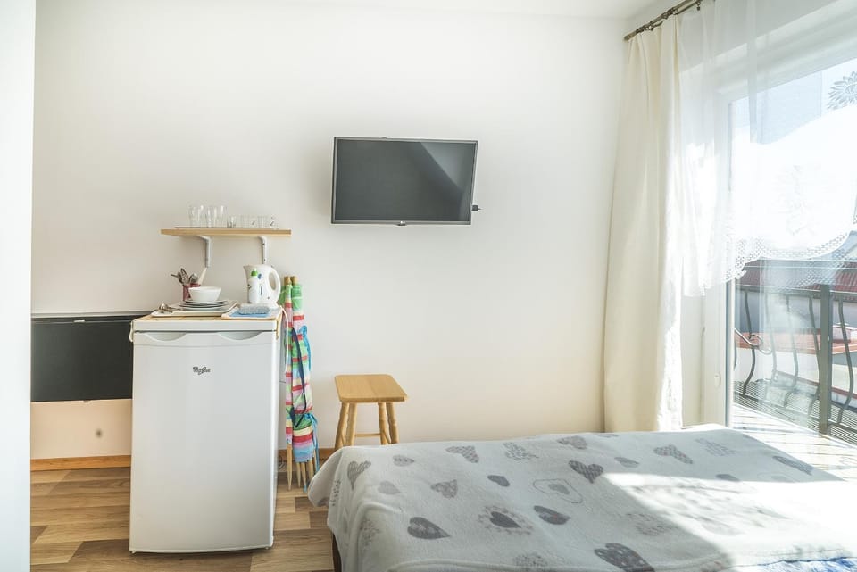 Pokój przytulny, czysty. Duże wygodne łóżko. W pokoju wszystko co potrzebne: szklanki, talerze, sztućce, czajnik i lodówka. Balkon z krzesłami i stolikiem. Szkoda że widok na podwórko a nie na morze ;) Świetna lokalizacji, wszędzie blisko do plaży, do PKP, do sklepów.
