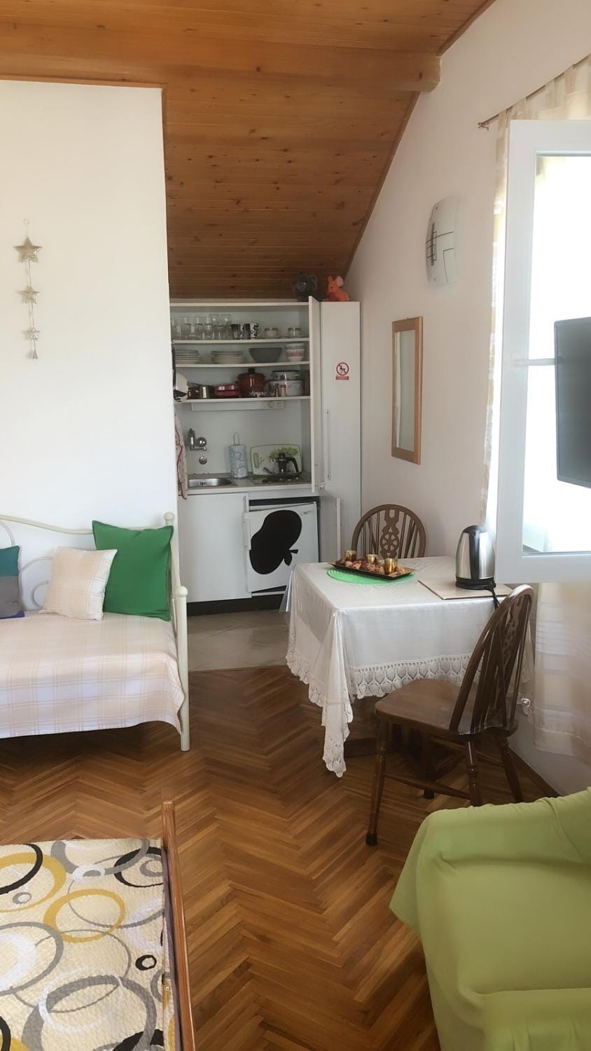 Apartman je imao sve sto nam je potrebno. Posebno je prelepa terasa na kojoj imaju i lezaljke i deo gde moze da se uvece sedne i odmori ili vecera sa pogledom na more. Prodavnica je bila u blizini kao i lepa plaza i centar grada. Posebne pohvale za vlasnicu apartmana koja je jako ljubazna i topla,osecate se kao da je poznajete ceo zivot a ne da ste dosli u smestaj na par dana.