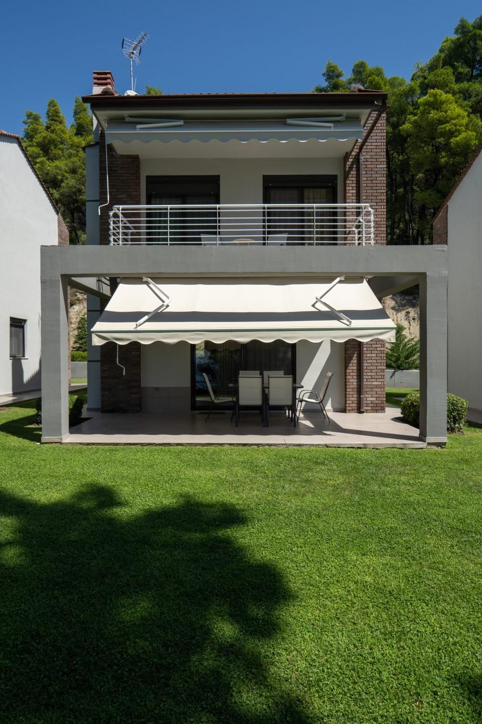 Vila si curtea ne-au depasit asteptarile. Curtea este foarte ingrijita, cu multa verdeata si flori. De pe terasa este o priveliste minunata catre mare, prin padurea de pini.