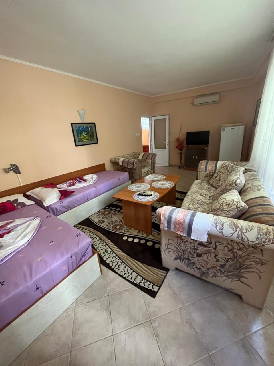 The stay was a lot better than expected. At first it was difficult to find the correct place, but once we found it, everything was great! The room was clean and modern. It had everything that was needed: air conditioning, 3 separate beds (like we asked), sofa with a table, fridge, TV (although we didn't use it) and even a balcony with clothes drying rack. Free wifi was nice and fast. Bathroom, although very compact, had everything + enough shower gel and shampoo for the 3 of us staying for 4 nights. At first the location seemed random, but it was actually right next to a pedestrian street with a lot of shops, including groceries, cafes and restaurants, pharmacy and souvenirs. And it was only 15 min walk away from the Old Town and 10 min walk away from South Beach. The personal was very helpful and easy to talk to in both English and Russian. Check out was early, but we were allowed to leave our bags at the reception until we had to leave the town. There was no option for breakfast, but there was a kitchen corner with coffee and appliances near the reception. And considering the opening times of food places at our street, there was no breakfast needed. For example the was an excellent pancake place literally 10 meters from the hotel door. Definitely recommending this to everyone!