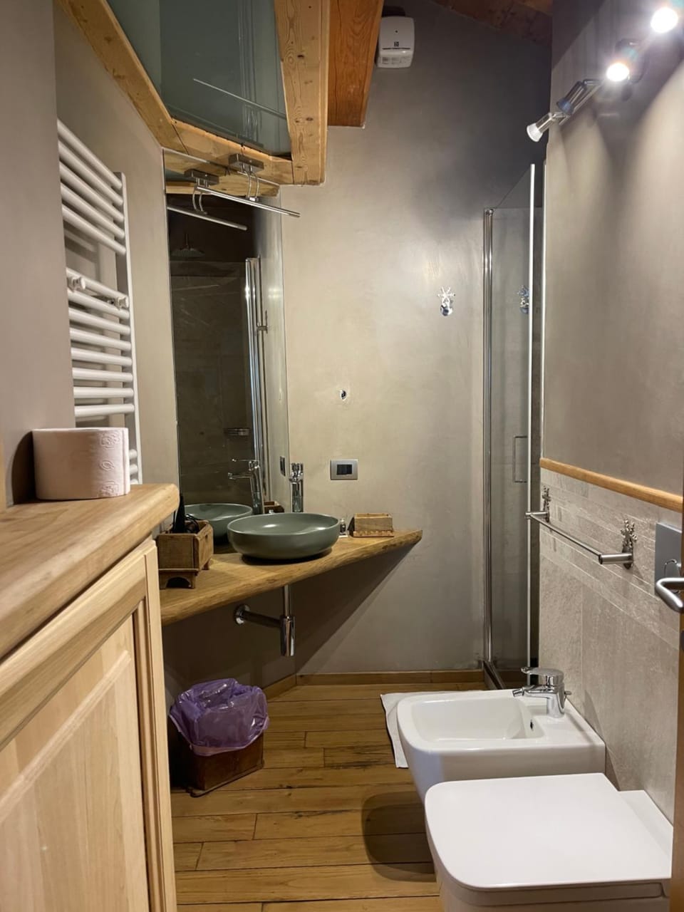 Bagno piccolino senza piani di appoggio. Lvandino collocato fuori, in stanza.