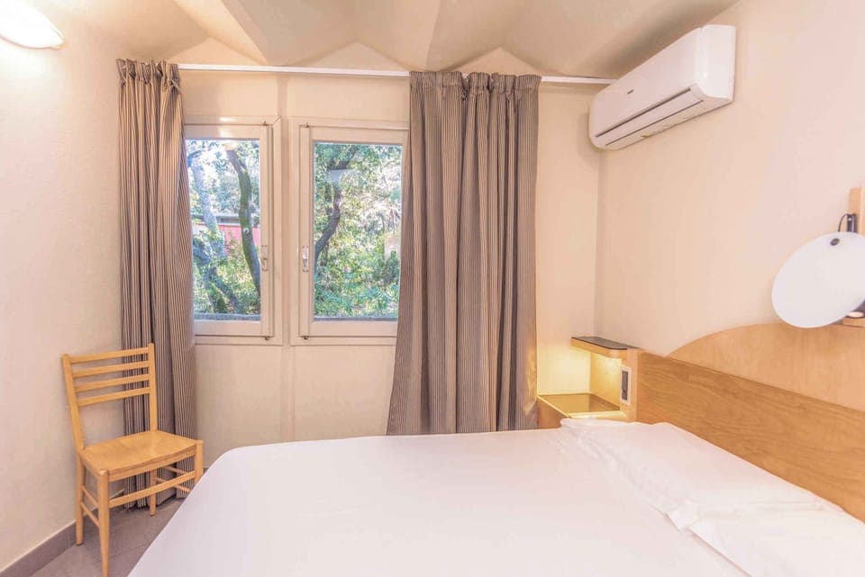 The entrance to your villa is on the mezzanine floor and leads up 11 steps directly into the living/bedroom. Living/bedroom (walk-through room) with 2 extra beds on couch/sofa, seating area, TV, air conditioning and dining area (4 seats). Bedroom with 1 single bed and 1 extra bed on bunk bed (top). Bedroom with 2 single beds and air conditioning. Kitchen with dining area (2 seats), electric cooker (4 hobs), extractor hood and refrigerator (freezer compartment). Bathroom with shower, 1 washbasin, toilet, bidet and window.