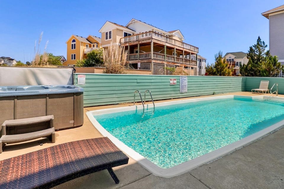 Business stays, family stays, couples stay, getaway vacation, and rental in Corolla at Oceanside: 2 minute walk to beach! Private pool, Tiki bar, Hot Tub! Sat.-Sat. for $1,015 for your next trip.