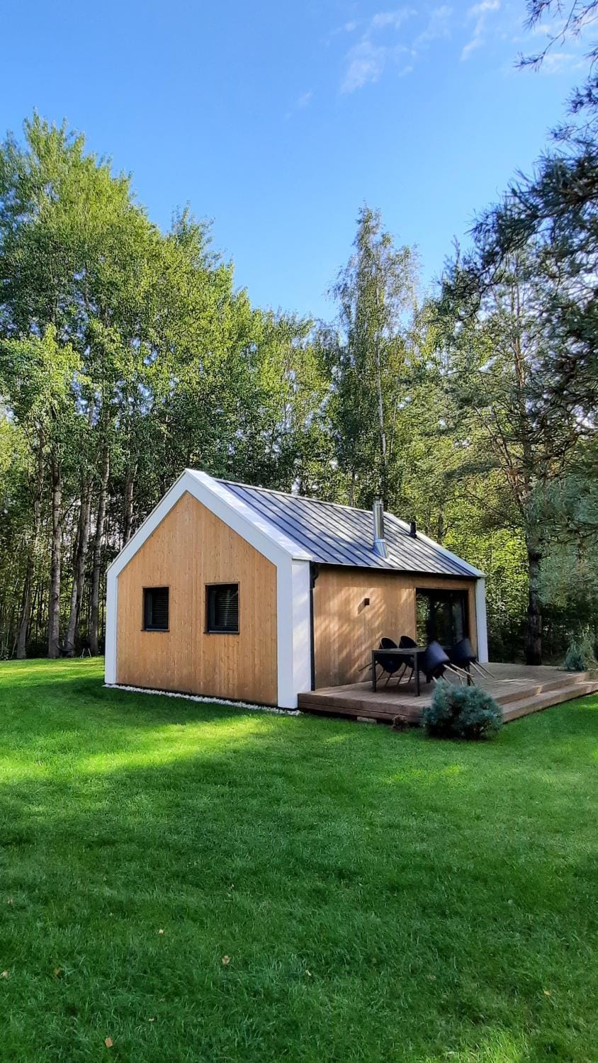Kompaktowy domek na dużej leśnej działce w miejscowości w której ciężko o zgiełk. Spokój, cisza i przyroda wokół. Rzut kamieniem do parku narodowego czy pobliskich restauracji (w sezonie czynna jest też lodziarnia i gofry tuż za płotem).