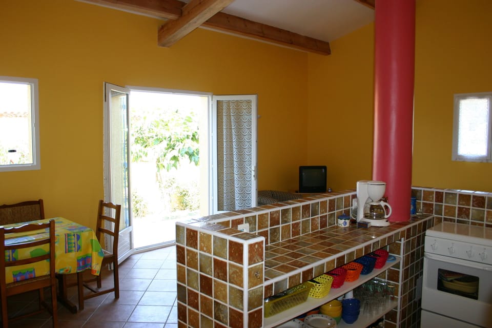 Outside, a large terrace in the shade of two magnificent mulberry-plane trees overlooking a garden with trees and flowers, with everything you need to take your meals in the great outdoors, with friends, relax (hammock, deckchairs, barbecue. ..)