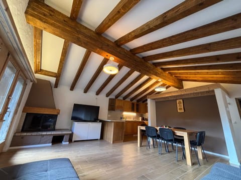 Appartement très spacieux. L'arrêt du bus pour joindre les remontées de ski juste en face bien pratique.