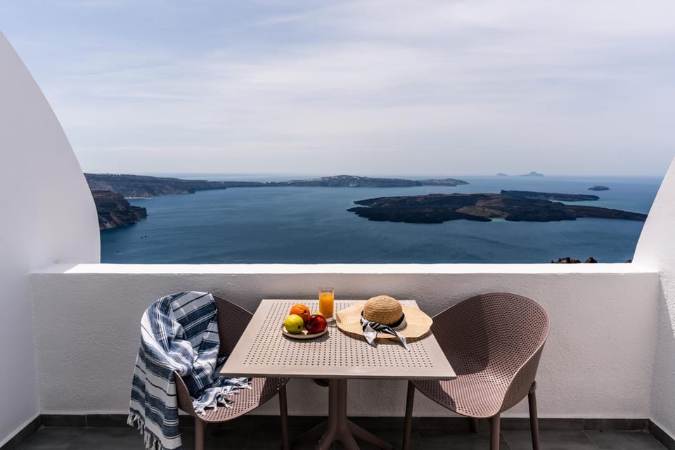 The location of this hotel is spectacular. It is on the path between Fira and Oia so if you want to walk to wither you are in luck. The views from the room were nothing short of spectacular and the balcony had an umbrella and wind protection so increased its usefulness. The room was large - exactly as seen on the Booking.com web site - and the bathroom with shower spacious with plenty off of hot water. The bed was very comfortable with good room on both sides for easy access.
