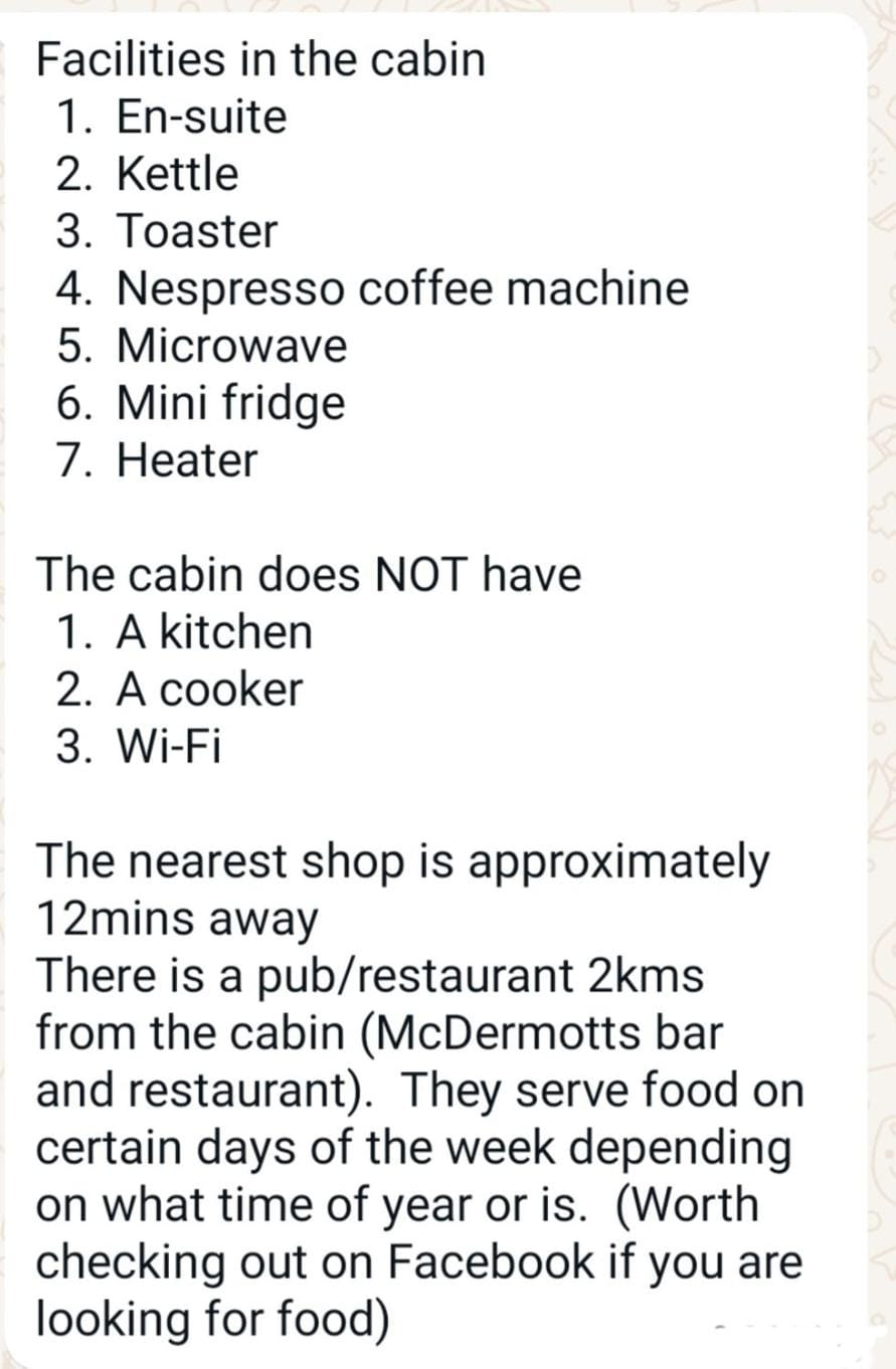 The cabin is very small. One night there was fine but would not have wanted to stay more than that. Now if I was a young couple or traveling on my own, this cabin would be perfect for a longer stay.