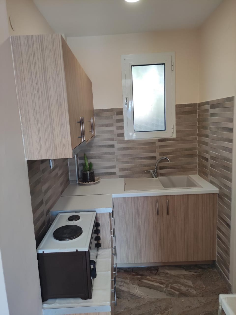 There is effective, but quite noisy, air conditioning in the bedroom and sitting room, plus a flat screen television in the bedroom. The bathroom is modern and tiled with a good shower. The little kitchen has a small fridge with freezer compartment, a little two-ring cooker and is equipped with very basic essentials, including a kettle. The host, Mr. Bikakis, is very accommodating and has provided us with various extra kitchen utensils during previous stays, when we've asked.
