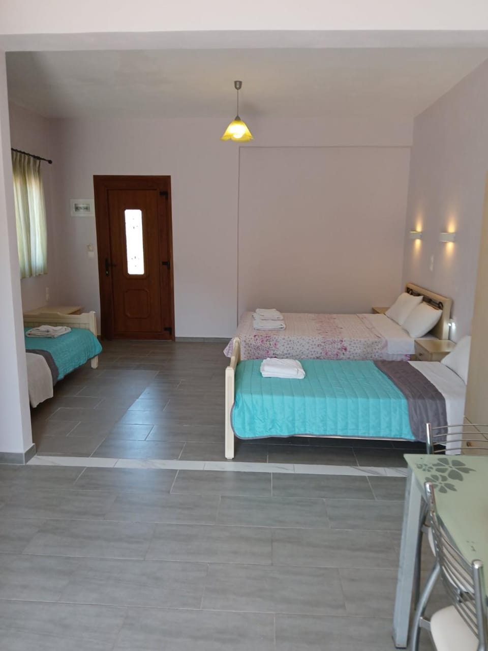Sehr ruhig. Im Grünen mit Oliven, Quitten und anderen wunderbaren Bäumen. Sehr freundliche Empfang. Gute Betreuung bei Fragen und Wünschen. Wir könnten unseren Frühstück auf dem Balkon einnehmen. Es gab kein Frühstück. Aber eine Minute entfernt gibt es ein Mini market und Bäckerei.
