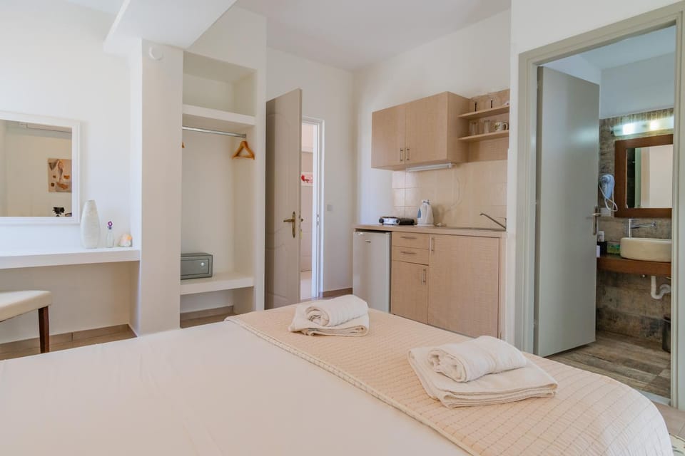 The accommodation is charming, simply decorated in authentic Greek style, and perfectly located by the sea. The beds are extremely comfortable, and the beautiful terrace — complete with high-quality sun loungers — offers a stunning view of the sea.