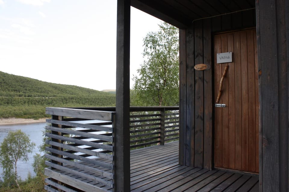 Upea näköala alas Tenolle! Ulkorakennuksen sauna oli mukava lisä. Sekä mökki, erillisen rakennuksen sauna/suihku- ja wc-tilat olivat siistit.