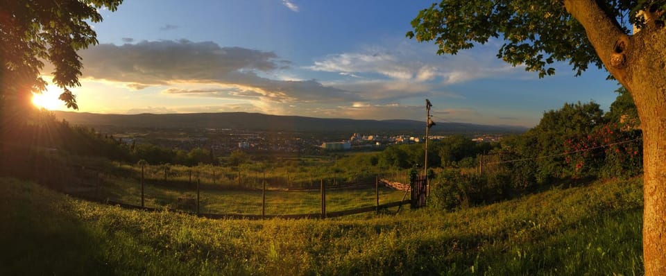 De locatie is geweldig. Vooral in het voorjaar of de zomer zal dit een fantastisch uitzicht hebben. Nu was het uitzicht in de avond over de stad Ingelheim magisch.