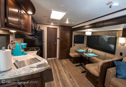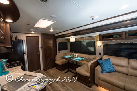 Our 40 footTravel Trailer is fully equipped with amenities to make you feel at home such as a cozy living space that boasts a large dinette and en extra lush sofa sleeper, a fully functional and stocked kitchen with a Full size refrigerator, TWO PRIVATE BEDROOMS: One bedroom features a KING size bed along with plenty of storage, a television and a private entrance/exit door. The Second bedroom has a QUEEN size bed with its' own private sliding door. Additional sleeping accommodations are in the living area where the dinette transfers to a bed for 1-2 guests and a full size sleeper sofa which can comfortably sleep another 2 guests! This RV has it ALL and so much more!!