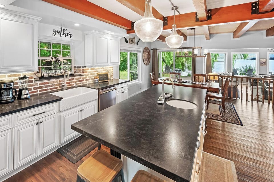 Floor-to-ceiling picture windows offer unobstructed lake views. Enjoy a Foosball table, wood-burning fireplace, and flat-screen TV in the spacious family room with comfortable seating.