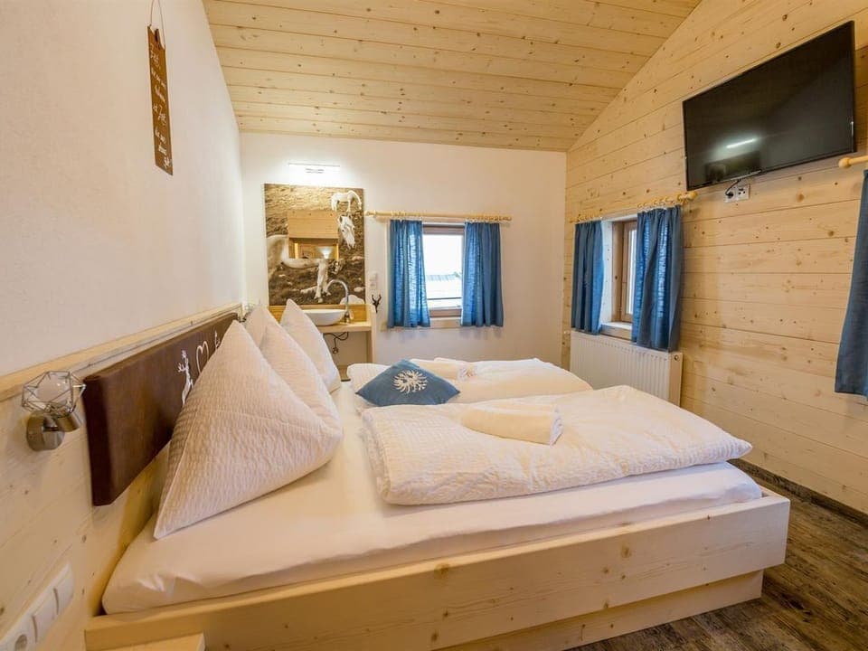 The apartment Kummerer was completely renovated in 2019 and u. a. designed with parquet floors. The apartment now has a fully equipped kitchen (stove, oven, toaster, refrigerator, dishwasher, kettle, etc.) with dining area. The apartment has a separate toilet, a separate shower and a bathroom with shower and toilet. The three bedrooms are a double room, a double room with an additional bed and a four-bed room. The bedrooms are carpeted and two have modern TVs. The apartment also has a ski boot heater and a spacious cloakroom.