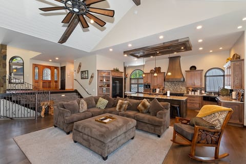 Felt at home here and enjoyed our stay, I just wish I had known that there is no way into the house at all without stairs. I brought my 70 yr old mother. She was only able to make it into garage, down to a second living room bedroom combo which also had stairs for her just to get to a bathroom, so she was excluded from the rest of the house. There is one more bedroom living room with its own bathroom combo that has 17 steep stairs to get too then a few more stairs to get to the other three bedrooms which share one bathroom with super deep tub/shower combo so have your knees in working order for this home. Some windows would not close & old food garbage had fallen behind the nightstands, I only noticed because I had to move one to plug in a fan. I did call about the windows not closing since a jackhammer (not anyone's fault) was being used next door but maintenance was out in a flash and shut them. Great neighborhood, we walked each night, one bathroom is in the pool table room which is a bit odd since no bedroom around but a pretty jetted one with more stairs. lol We used the game room, tv's could have used some instructions as we never figured out some of them & maintenance didn't know how to get them on or use surround sound. The top two bedrooms have outdoor patios that due to the spiderwebs, we couldn't use. Not simple spider webs of 5 or fewer but something out of a horror film in the room with a queen bed in it. The bunk bed bedroom patio was not that bad. Not anyone's fault, just you are in the woods near water so it is not city life. We rented a pontoon boat and enjoyed the outdoor hot tub but its cover is not on the arms so you have to manhandle the heavy thing on and off, takes two people. Ours at home is almost like that, we have one arm that works. The beds were soft and comfortable. The kitchen was fun to cook in and we even used the fireplace in the living room our last night. I would stay again but just can't bring my mom. I bet most homes are built like this here, I just had no clue and it is hard to tell from photos. I had deliveries from DoorDash with no issues too which was great. You have to bag up all your trash and take it with you...ALL of it when you leave to a city common dump place, so be prepared for that too. I did not know what the nest controllers did or how to use them as it said the place has no AC so maybe for floors? I really did enjoy the home and will stay again. I hope the lake's water level rises soon.