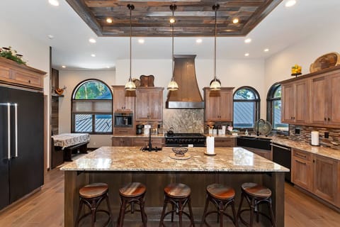 The kitchen and dining spaces are designed to bring everyone together while showcasing beautiful lakefront details. Premium appliances and generous seating make this area perfect for both everyday meals and special gatherings.