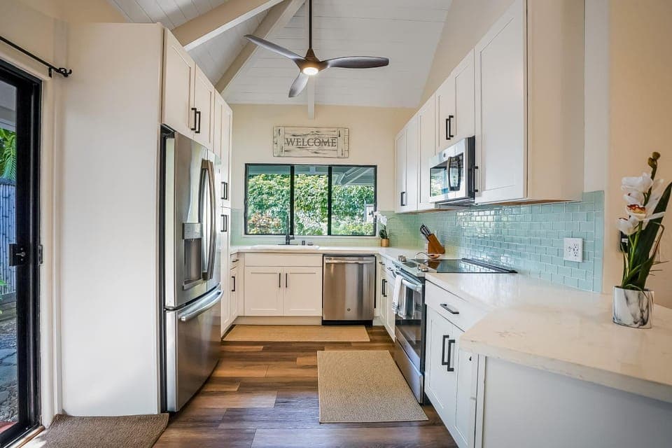 Outdoor shower, beautiful backyard, kitchen with many supplies, layout of the house is perfect, nice to have the washer & dryer, everything you need to feel like you are right at home!