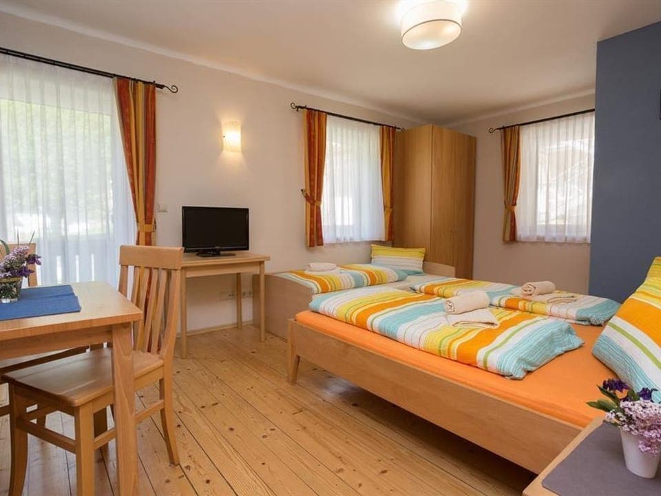 Our Säuleck apartment offers space for 2 to 6 people in 2 rooms (each with a double bed and an additional bed). Each room is equipped with its own shower, toilet and satellite TV. On the sunny balcony you can enjoy the breathtaking view of the Mallnitz mountains. The lounge invites you to linger and the kitchen is fully equipped with an electric stove, microwave, mini oven and refrigerator.