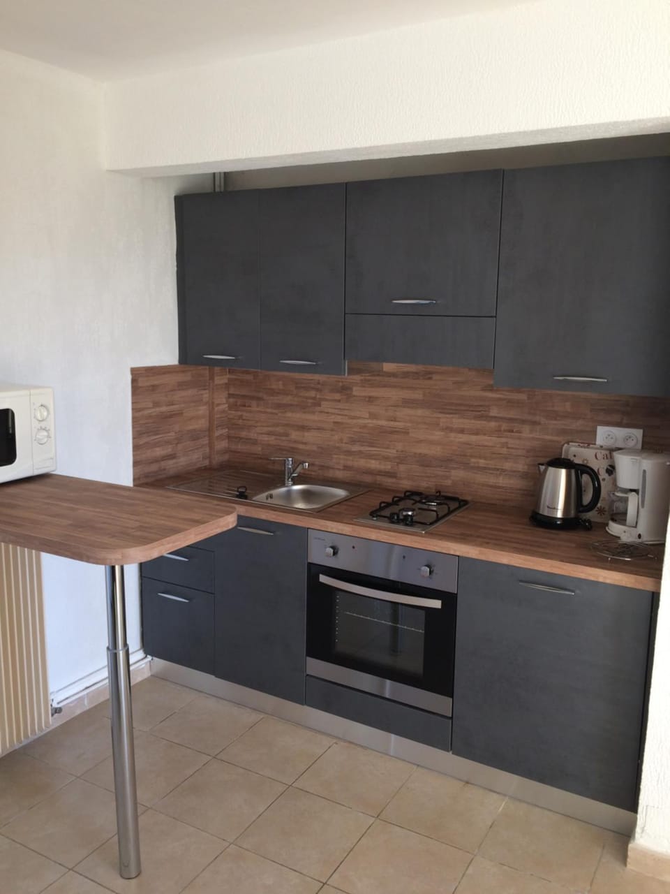 Die Wohnung hat eine kleine Küche mit einem normal großen Kühlschrank, einem 2-Flammenherd und einem Elektrobackofen. Eine Spülmaschine wäre noch ideal gewesen, aber dafür ist kein Platz mehr.