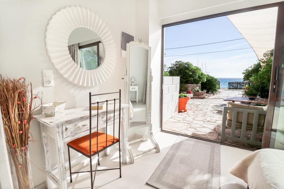 The view from the balcony into the sea is amazing and sunset happens right there. Also, they have their own beach chairs you can use. They also have some toys for kids like a slider etc and a high chair is available in the balcony which makes it very convenient. The AC units in the rooms work reeeeally well. The apartment is spacious and the lady that runs it is very friendly.