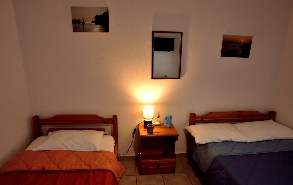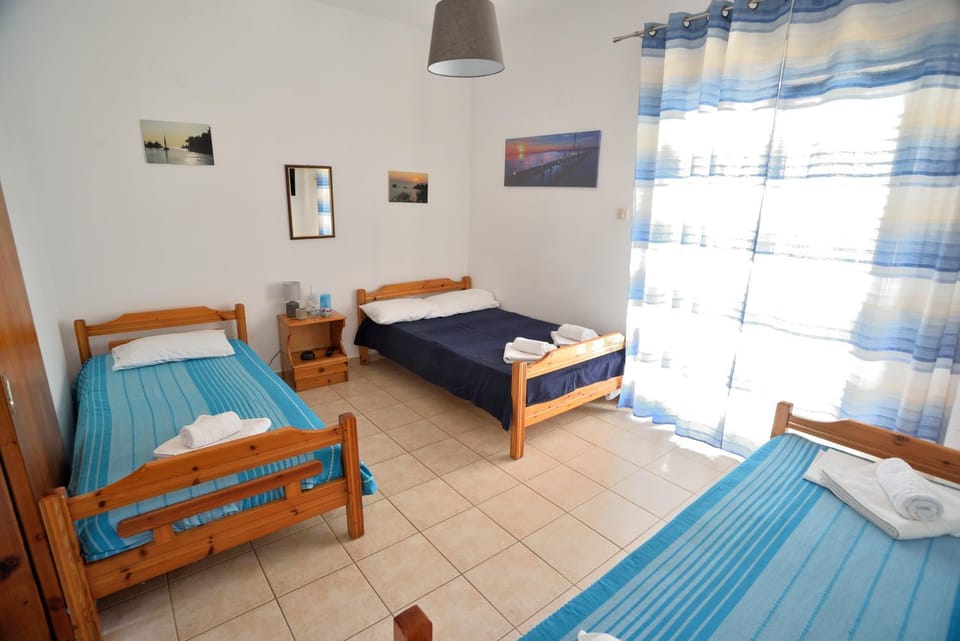 There are so many different room locations and views, we can only say for our particular room on ground level floor looking at the main street. Host is very helpful, fluent in English and she explained everything we needed to know during our stay. There were many small nice touches on our arrival. A plate with bikkies and two coffee/teacups with Greek ground coffee bag were waiting for us on the kitchen table as a welcome gesture. That is exactly the first thing you need on arrival after a long drive, so very thoughtful. Everything was functional and could not find a fault. Room was very clean and beds were comfortable, mozzie mesh sliding door and beautiful spacious terrace with wild grape vine as a sun protection. Air-con was located in the kitchen facing toward our rooms but worked well and since it was not in our bedroom, there was no direct blow of cold air to any of our beds and therefore more quiet.